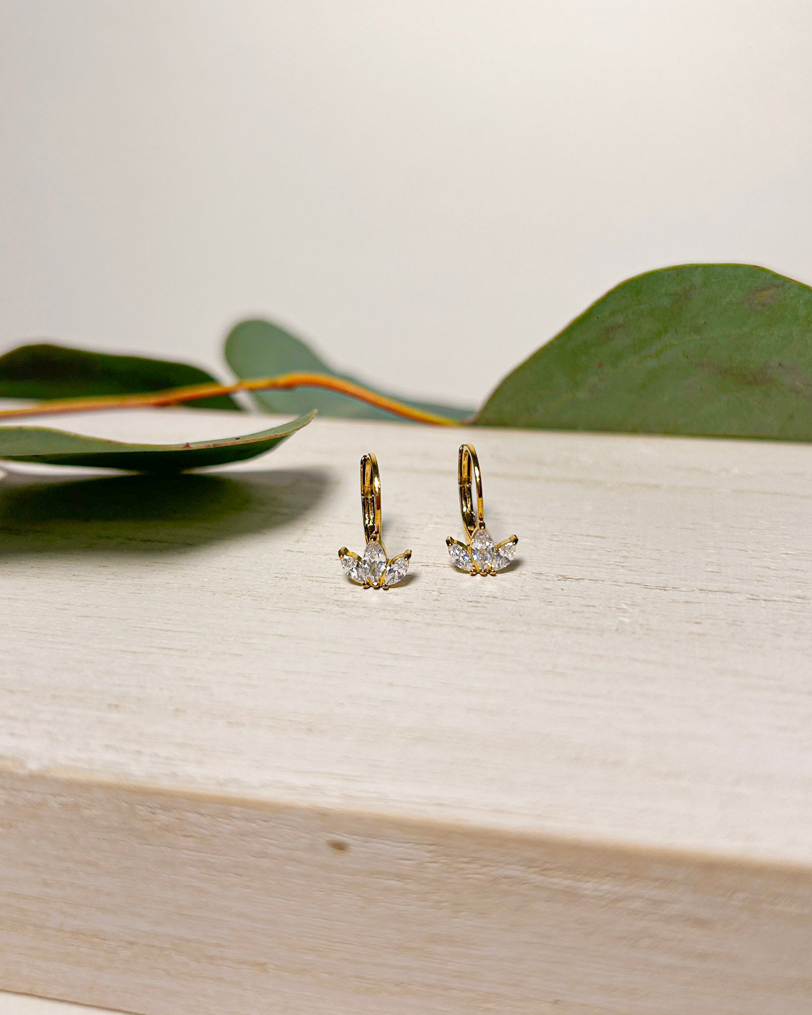 Delicate gold-tone hoop earrings adorned with sparkling flower-shaped crystal accents. These elegant earrings bring a touch of femininity and charm to any outfit, perfect for both everyday wear and special occasions.